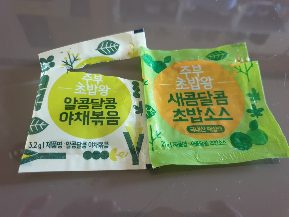 야채볶음 후레이크와 초밥소스 2개의 봉투가 들어있습니다.