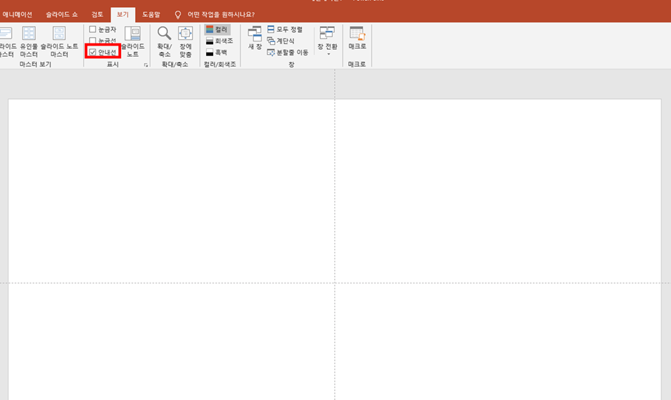 PPT를 켠 후 처음 작업하는 부분이 바로 '안내선'의 설정입니다.