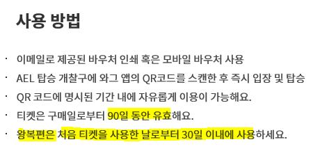 위 이미지처럼 티켓은 90일 동안 유효하고, 왕복편은 처음 티켓을 사용한 날로부터 30일 이내에 사용하면 된다고 합니다.