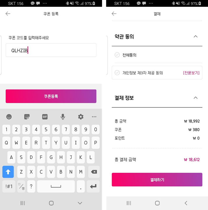 바로 결제를 하려다가 선택란 밑에 앱에서 결제시 2% 추가 할인 코드가 있어 앱을 다운 받고 해당 코드를 적용 하였습니다.