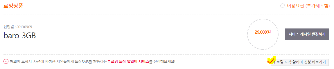 : 위 이미지 오른쪽하단에 보시면 'T로밍 도착 알리미 신청'이라는 서비스가 있습니다.