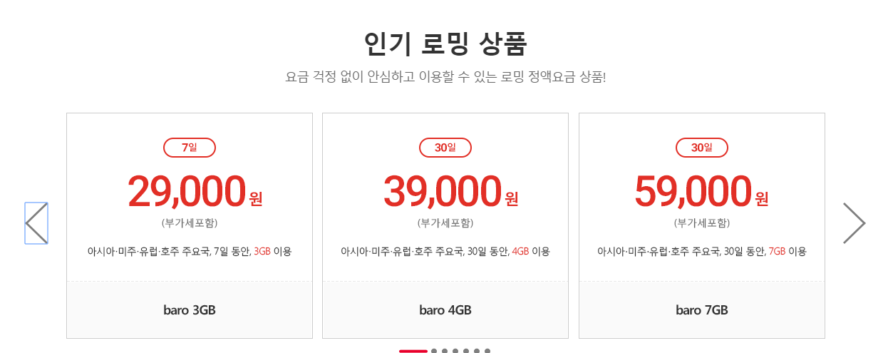 아래 이미지처럼 '인기 로밍 상품'을 따로 리스팅해놓았는데요. 넘겨서 눌러 보시면 알맞은 요금제를 비교 하실 수 있습니다.