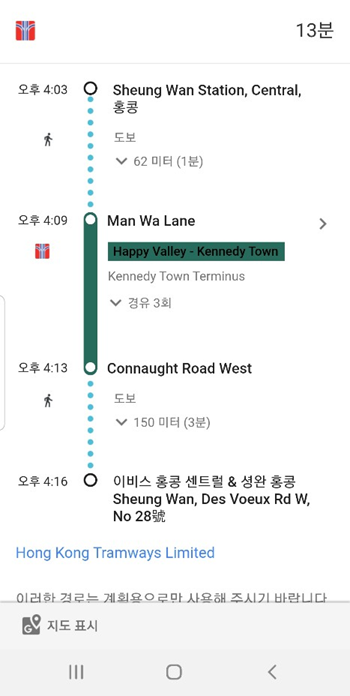 저는 [Happy valley - Kennedy Town] 라인의 트램을 탔습니다.