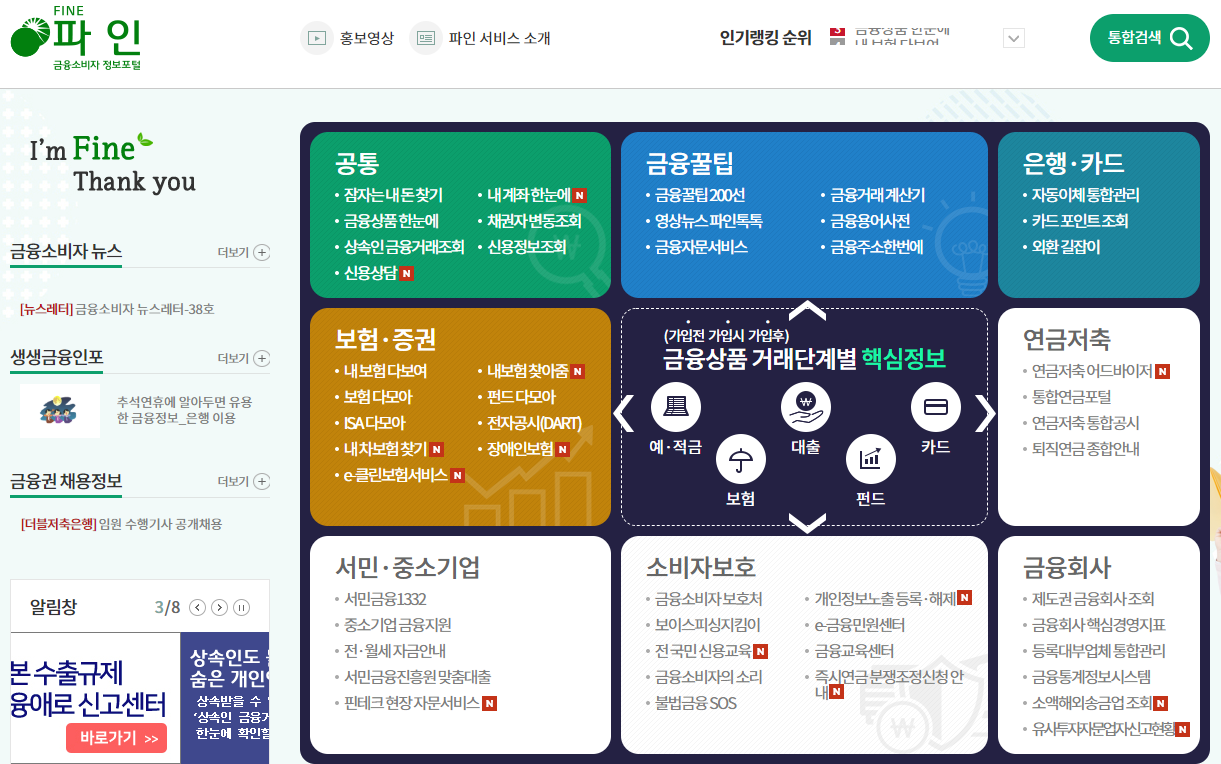 금융소비자가 금융거래과정에서 필요하거나 알아두면 유익한 금융정보를 망라하여 제공, 금융감독원 파인, 금감원 파인, 휴면계좌 통합조회, 금융상품 한눈에, 연금저축 통합공시, 보험다모아, ISA다모아, 상속인금융거래조회, 통합연금포털, 페이인포, 보험가입조회, 휴면계좌 통합조회, 카드포인트조회, 금융꿀팁200선 등