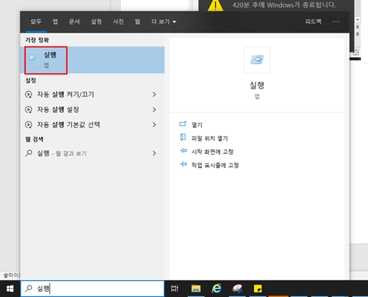 2) 바탕화면 하단에 있는 검색창에 '실행'이라고 쳐서 앱 열기