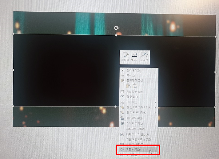 사각형을 클릭한 뒤 오른쪽 마우스를 눌러주시고, 다음과 같은 박스에서 [도형 서식]을 클릭합니다.