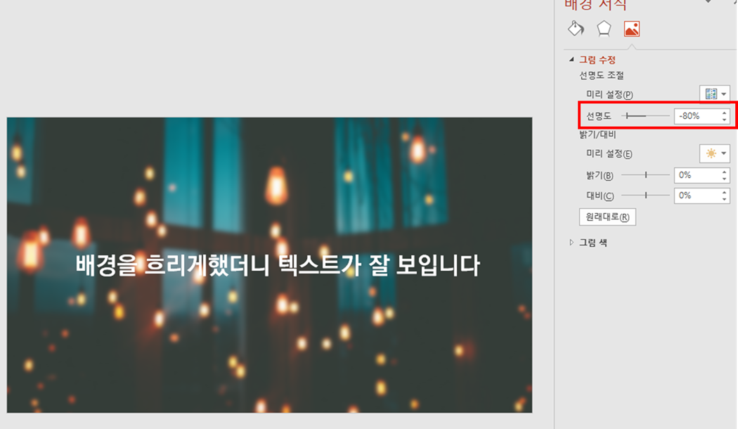선명도를 낮추었더니 은은한 느낌이 나면서 텍스트가 상대적으로 잘 부각됩니다.