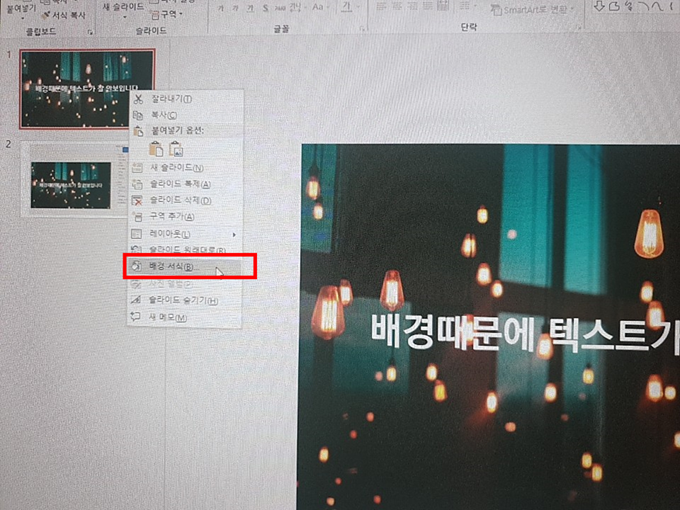 슬라이드에 마우스를 대고 오른쪽을 클릭하여 상단과 같은 박스가 뜨면 '배경 서식'을 눌러줍니다.